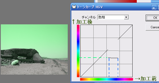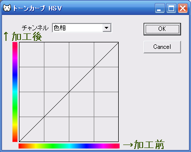 トーンカーブをフリーハンドで調整できる鉛筆ツールはnekopaintにはついていません。ただしHSVカーブの色相だけは鉛筆ツールと同じように操作します。